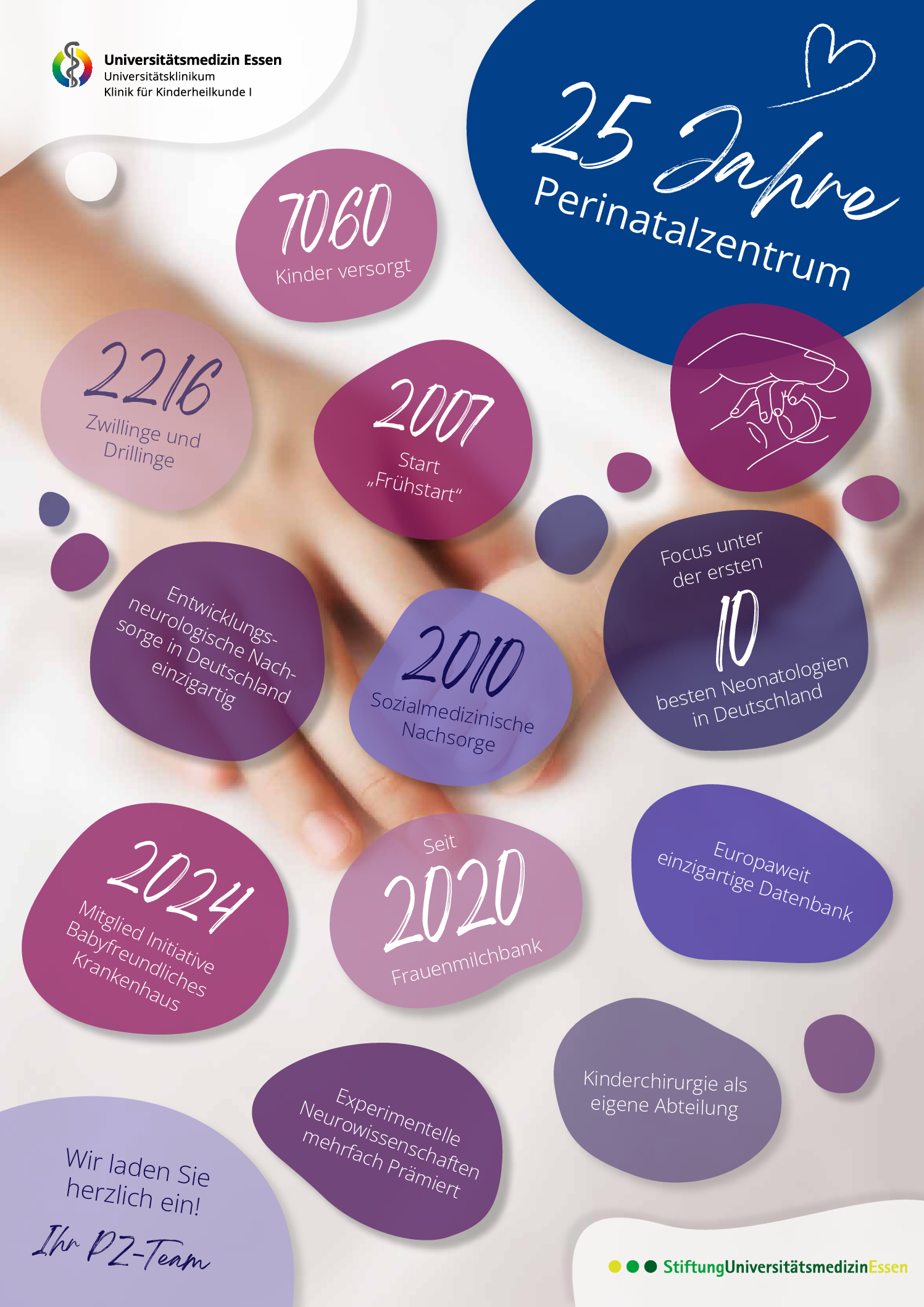 | Am Weltfrühchentag, Montag, 17. November, feiert das Perinatalzentrum der UME sein 25-jähriges Bestehen. Seit der Eröffnung im Jahr 2000 wurden hier über 7.000 Kinder betreut – darunter 1.650 Frühgeborene mit einem Geburtsgewicht unter 1.500 Gramm und 74 sehr kleine Frühgeborene unter 500 Gramm. „Die Entwicklungen in der Perinatalmedizin haben unsere Möglichkeiten, Früh- sowie kranke Neugeborene und ihre Familien zu unterstützen, enorm erweitert. Mit einem interdisziplinären Ansatz und innovativen Projekten wie der spendenfinanzierten Elternberatung Frühstart und U&ME Kids bieten wir umfassende Beratung und Besuche zu Hause durch einen mobilen Nachsorgedienst – über den Klinikaufenthalt hinaus“, erklärt Prof. Dr. Ursula Felderhoff-Müser, Direktorin der Kinderklinik I. |